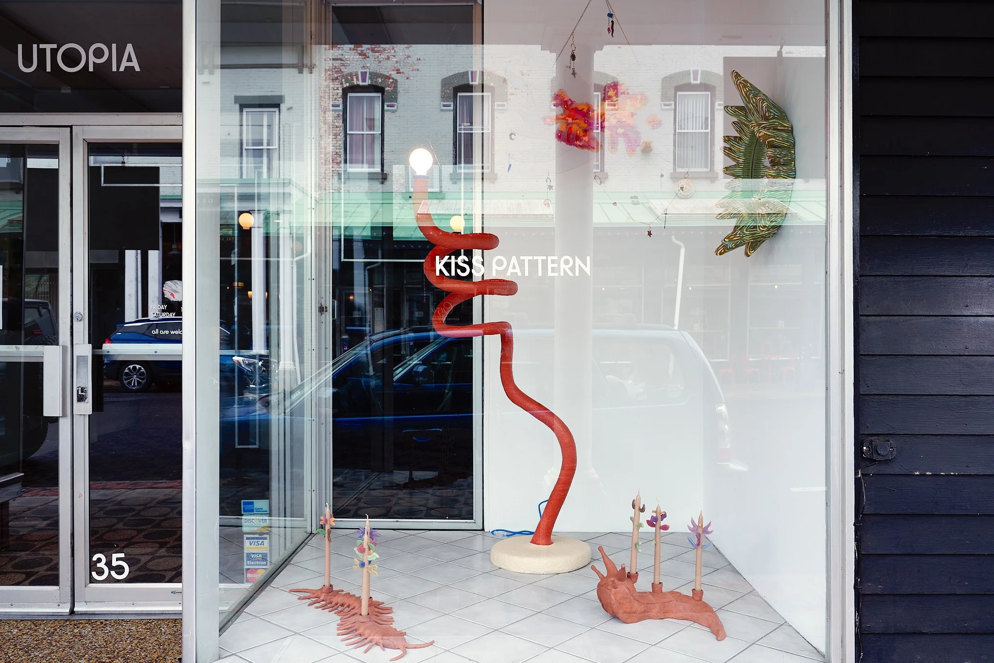 Art gallery window display with abstract red sculpture, wall-mounted artwork, colorful small sculptures on the floor, and "Kiss Pattern" text. Reflections of street and buildings in glass.