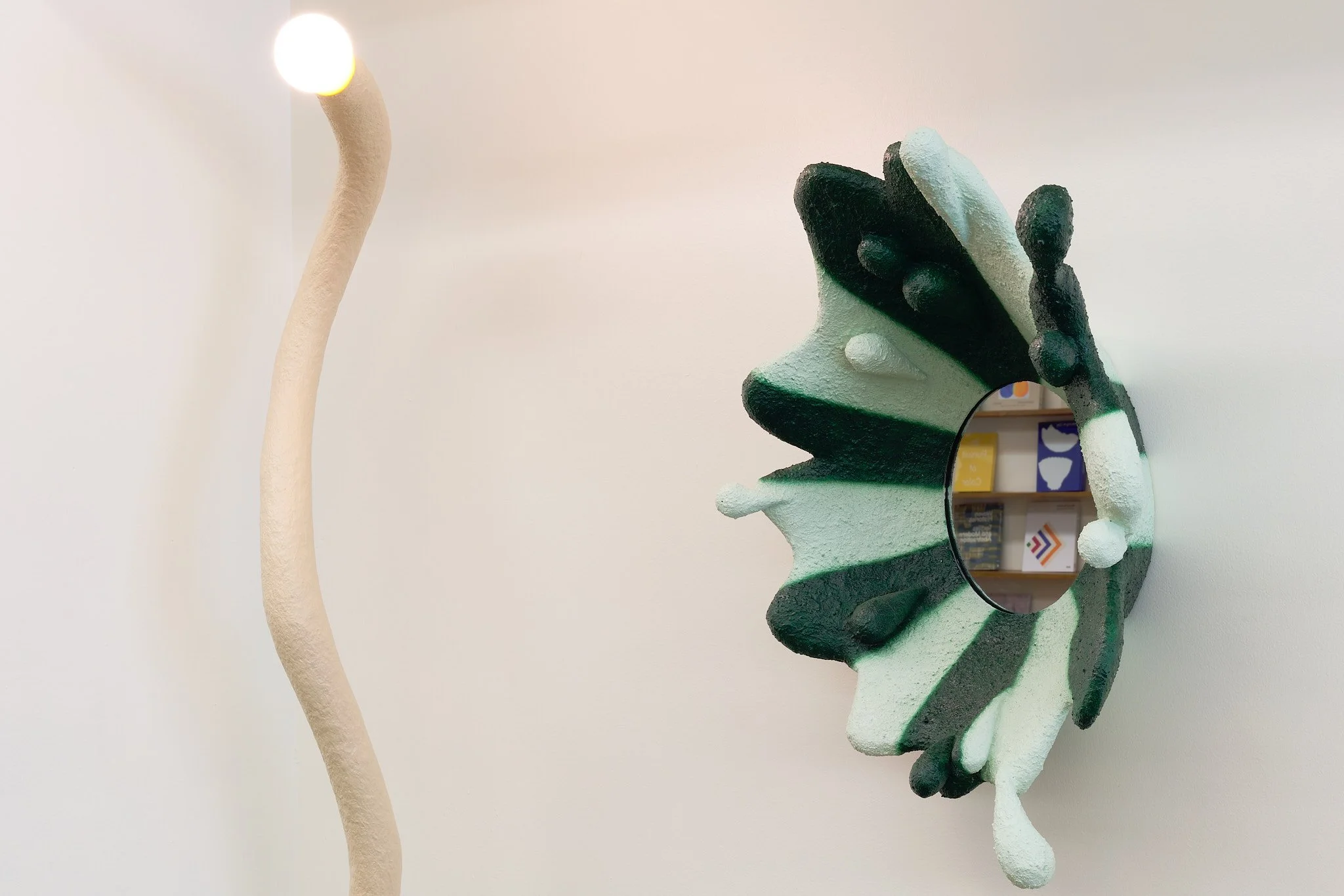 A uniquely designed wall-mounted mirror with a textured, green and white frame that resembles an abstract splash shape. Beside it is a curved lamp with a round light bulb on top, standing against a plain wall.
