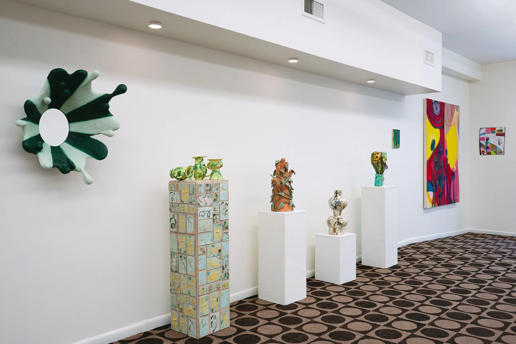 Contemporary art gallery interior with sculptures on pedestals and wall art, featuring a green and white abstract wall sculpture, ceramic vases, mixed media paintings, and tiled pedestal.