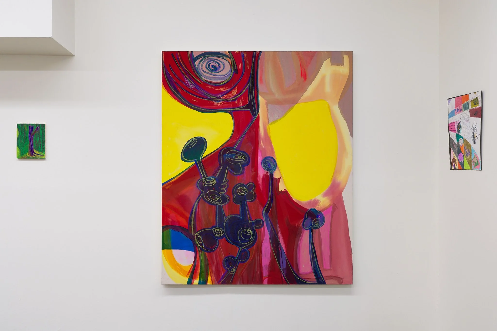 Art gallery interior with two square paintings and a textile art piece on a white wall. The paintings feature abstract designs, one with pink and blue colors and the other with black and green. The textile art piece is in shades of pink, purple, and