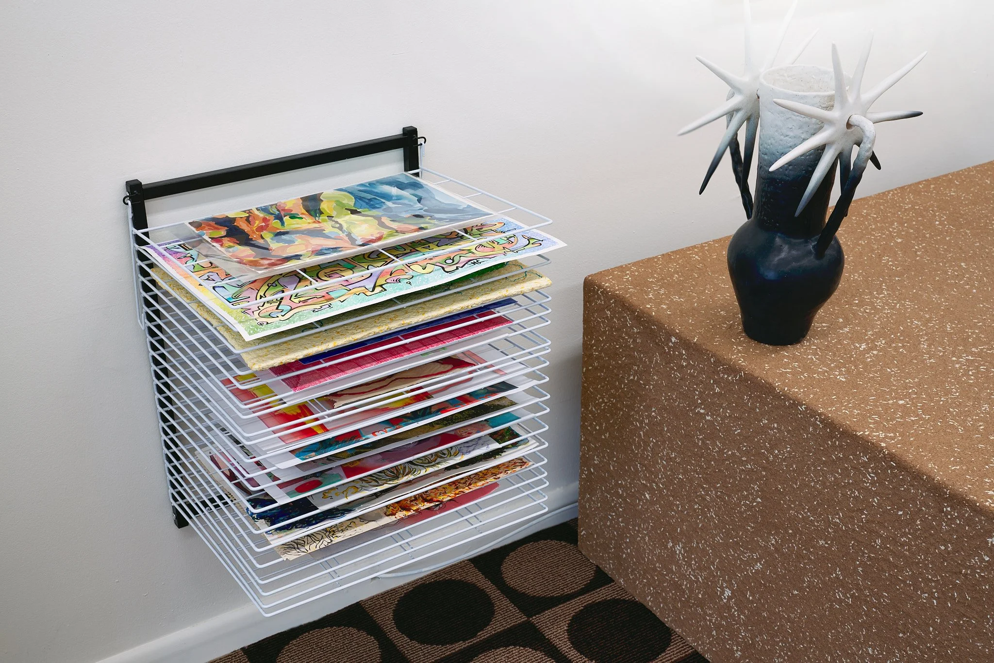 Wall-mounted drying rack with colorful paintings, brown textured table with dark vase featuring white spiky decorations.