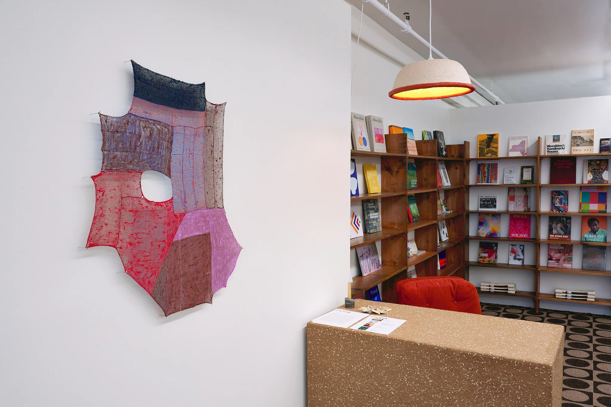 Abstract textile art on wall, bookstore with wooden shelves filled with colorful books, a table with documents, and a red chair under a ceiling light.
