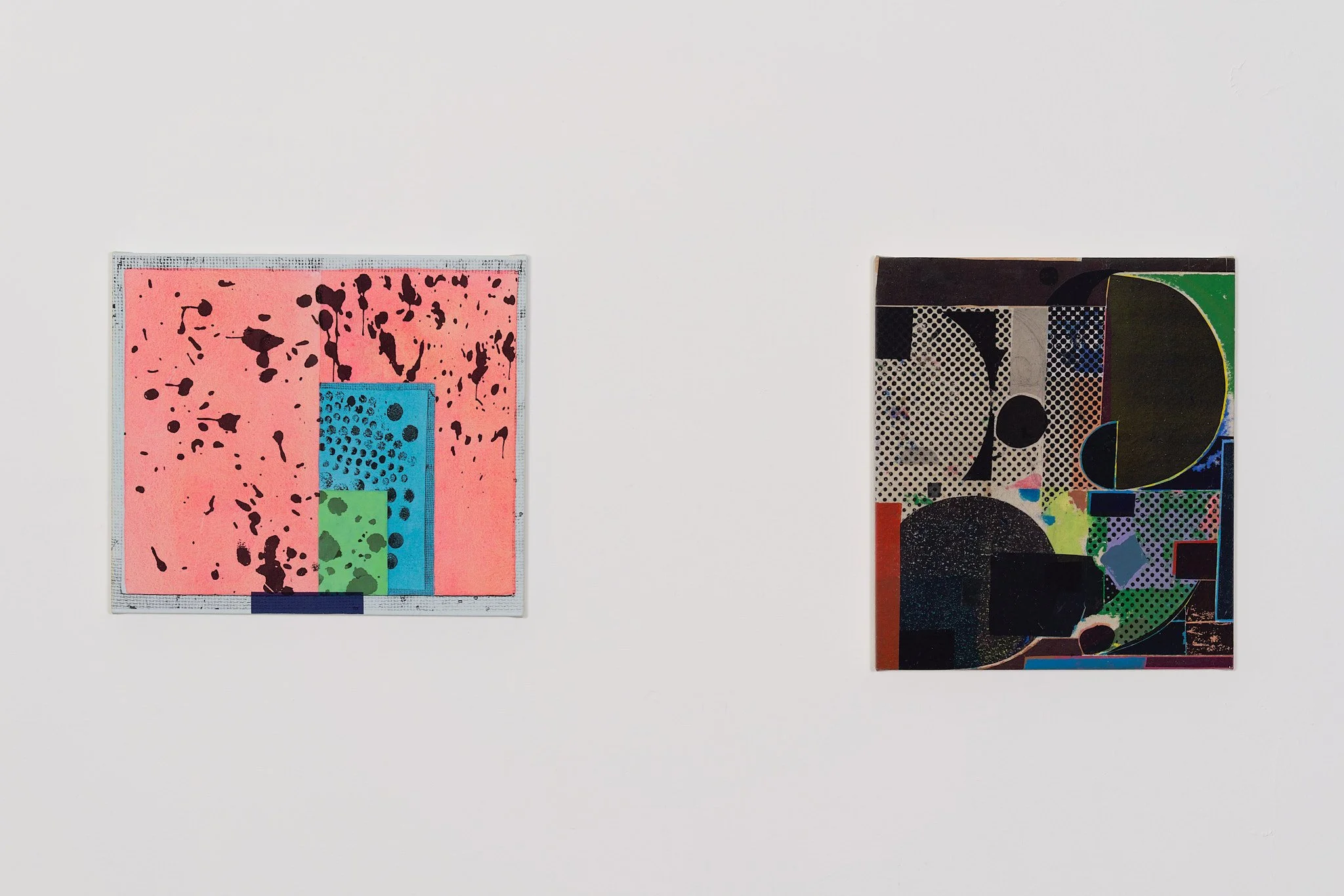 Two abstract artworks displayed side by side on a plain wall. The left piece features a pink background with black splatters and blue and green geometric shapes. The right piece is a combination of circular and geometric patterns in various colors li