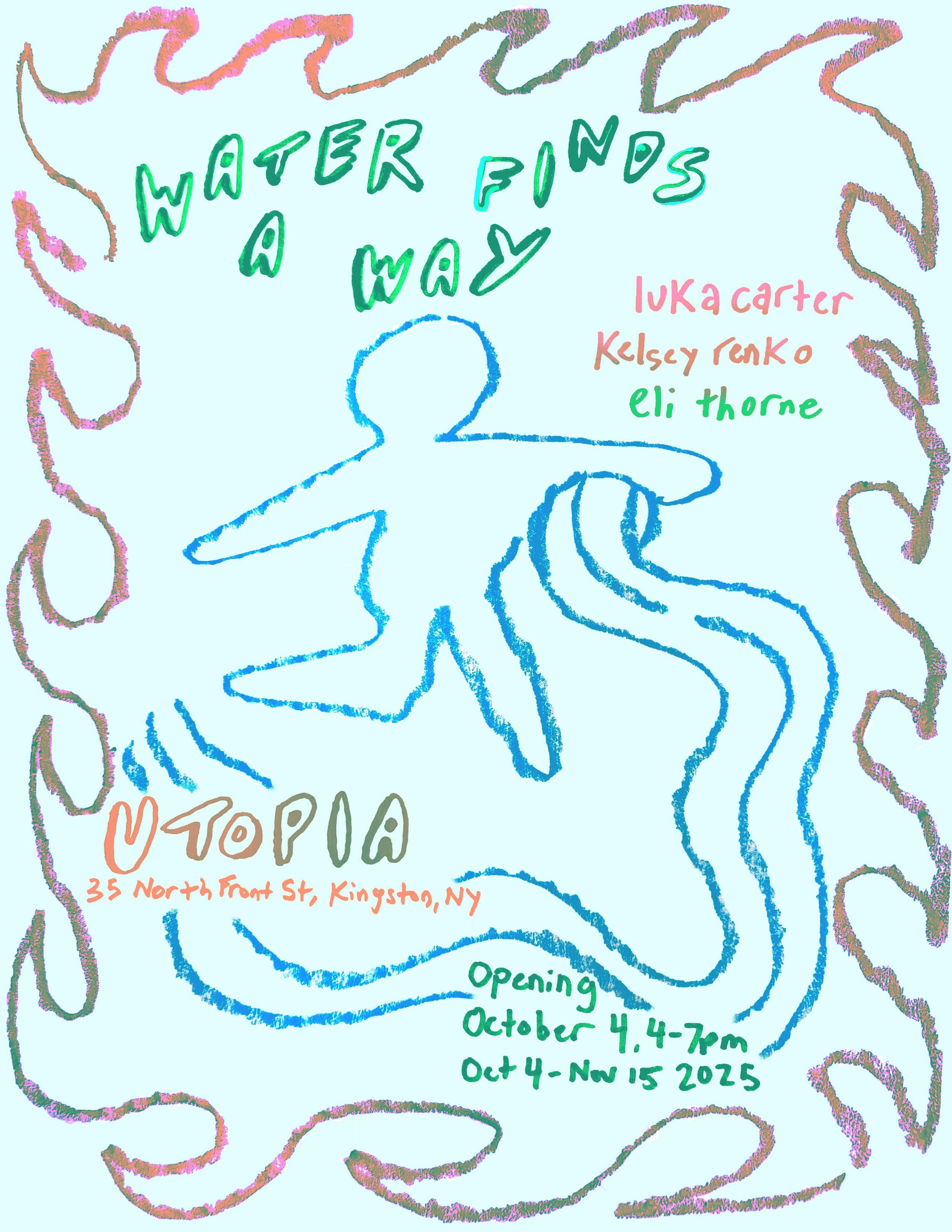 Water Finds a Way fluidly draws on the expressive gestures of three artists working in the Hudson Valley. Fish out of water, urgent auras, and springing safety cones color Utopia’s dotted terrain. Whether strictly or metaphorically representing water, each artist conveys its liquid looseness through markmaking, form, and content. Carter’s comic ceramic vessels and fountains are enriched with whimsically dense drawings, illustrating a playful and transient daily life. Renko’s impassioned paintings explore the body, feeling, and intimate relationships through layered patterns, shapes, and lines in a turbulent flux. Thorne’s rapturous landscapes express righteous rage through sharp tsunamis while flying fish navigate spiritual scenes by way of hearts and stars. Together the artists’ hands celebrate vulnerability through tactile and abstract figuration with wonder and sensitive naïvete. Their relationships to water touch on timeless themes of love, floating adrift, emotional intensity, and the eccentric pleasures of pedestrian experience. Their dialectical flow and friction with materials counters the ubiquitous smoothness of an increasingly accelerating and online economy.